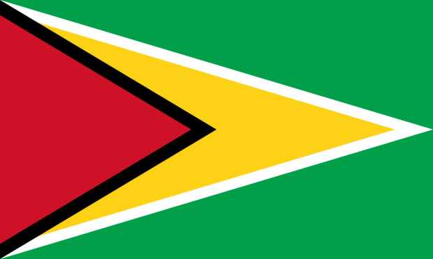 The national flag of Guyana consists of a green field with a wide white crossbar in the center. On the white crossbar there are four five-pointed golden stars, which remind of the four traditional ethnic groups of the country. The upper part of the crossbar is colored red, representing the courage and bravery of Guyanese. At the bottom of the crossbar is a black triangle, representing the country's many minerals and natural resources.